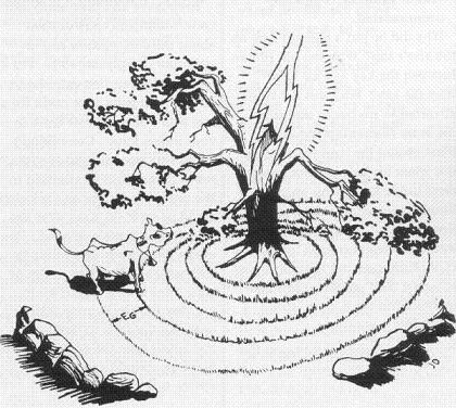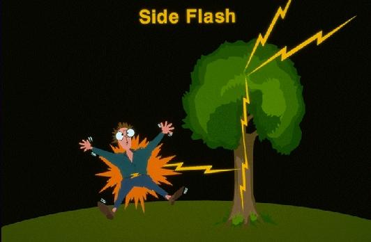 Side Flash - แม้ชายหนุ่มเคราะห์ร้ายจะไม่ได้แตะส่วนใดส่วนหนึ่งของต้นไม้ที่ถูกฟ้าผ่าโดยตรงเลยก็ตาม แต่กระแสไฟฟ้าก็อาจจะกระโดดเข้าจู่โจมเขาจากด้านข้างได้