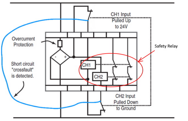 นอกจากนั้น MSR จะสามารถตรวจสอบการลัดวงจรถึงกันของสัญญาณอินพุตได้ โดยการจ่ายไฟออกไปที่อุปกรณ์อินพุตให้มีขั้วตรงกันข้ามกัน คือ อินพุตหนึ่งเป็นไฟบวก และอีกตัวหนึ่งเป็นไฟลบ เมื่อเกิดการลัดวงจรถึงกันมันจะทำให้วงจร Overcurrent Protection ทำงานและตัดวงจรเอาต์พุตส่งผลให้โหลดหยุดทำงาน