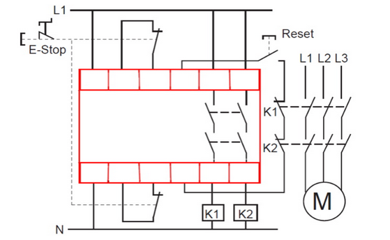 จากรูปด้านบน..คือตัวอย่างการวงจรการต่อ MSR ใช้งานร่วมกับ E-Stop เพื่อใช้งานร่วมกับวงจรควบคุมมอเตอร์ ซึ่งนับว่าเป็นความสามารถอีกอย่างหนึ่งของ MSR โดยจะทำหน้าที่ตรวจสอบว่า Magnetic Contactor (K1,K2) ทำปกติหรือไม่ โดยการต่อสัญญาณจากหน้าคอนแทคแบบ NC ของ K1,K2 เข้ากับสวิตช์ Reset