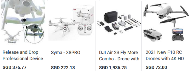 ตัวอย่างโดรนแบบต่างๆและราคาในหน่วยดอลลาร์สิงคโปร์ (01 April 22)