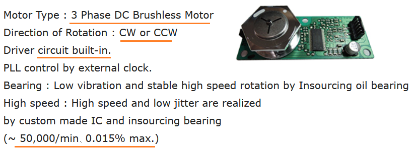 มอเตอร์แบบนี้จะเป็นมอเตอร์ที่มีขนาดเล็กจิ๋วแต่มีความเร็วรอบค่อนข้างสูง ซึ่งเป็นชนิดที่นิยมใช้งานทั่วไปกับเครื่องเลเซอร์ ปริ้นท์เตอร์และในเครื่องถ่ายเอกสารแบบดิจิทัล