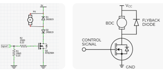 4) ตัวเก็บประจุนี้จะดูดซับ (absorbs)แรงเคลื่อนไฟฟ้าเหนี่ยวนำด้านกลับ หรือ back emf กล่าวคือกรณีที่มีการหยุดหรือมีตัดกระแสไฟฟ้าออกจากมอเตอร์แบบทันทีทันใด โรเตอร์ของมอเตอร์จะยังไม่หยุดหมุนแบบทันที ซึ่งในกรณีนี้มอเตอร์เปลี่ยนสถานะการเป็นเครื่องกำเนิดไฟฟ้าชั่วขณะและผลิตแรงดันย้อนกลับ ซึ่งในมอเตอร์ขนาดใหญ่ระบบก็จะใช้ไดโอดที่เรียกว่า freewheeling diode หรือ FLYBACK Diode หรือตัวเหนี่ยวนำ (inductor) เข้ามาช่วยต้านทาน หรือกำจัด back emf ให้หมดไป แต่ในมอเตอร์กระแสตรงหรือดีซีมอเตอร์ขนาดเล็กจะใช้ตัวเก็บประจุแทน
