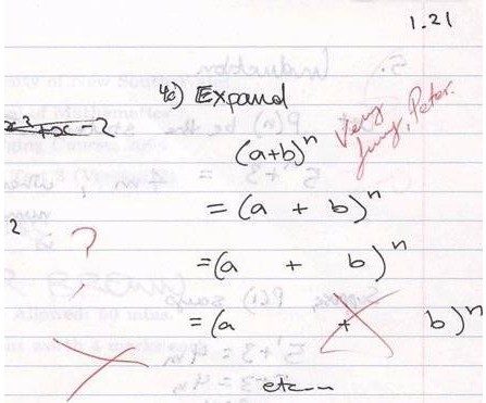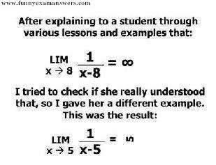 อันนี้ ถ้าเรียนแคลคูลัสแล้วจะช่วยให้ฮายิ่งขึ้น ,,, ก็คือ อาจารย์คนนี้แกสอนเด็กว่า ถ้าลิมิตเข้าใกล้ a ของ 1/(x-a) แล้ว คำตอบมันจะได้เท่ากับ อินฟินิตี้ แล้วแกก็ยกตัวอย่างกรณี a=8 ,,, ปลาดุก และปลากดว่า ไอ่เครื่องหมายอินฟินิตี้ มันดันไปเหมือนกับเลข 8 ตะแคงข้าง ,,, เด็กมันก็เลยเข้าใจว่า คำตอบของโจทย์ทำนองนี้ ก็คือ ให้เอาตัวเลขไปตะแคงข้าง พอลิมิตเข้าใกล้ 5 ปุ๊บ มันก็ตอบเป็น เลข 5 ตะแคงข้างทันที เออ เอากับมัน
