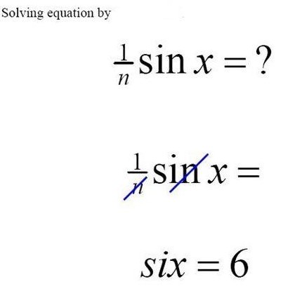 อันนี้ไม่ต้องมีคำบรรยายใดๆให้มันลึกซึ้ง คนแก้สมการตัดตัวเลขมันมือไปหน่อยยังไงไม่ทราบ ดันไปตัด 1/n กับ ตัว n ของคำว่า sin แล้วเผอิญมันกลายเป็นคำว่า six ก็เลยตอบ 6 ไปซะดื้อๆ ฮ่วย!