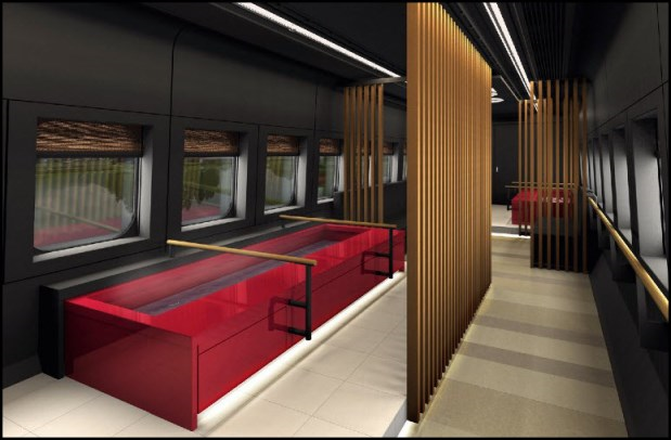 บริษัท เจอาร์ อีสต์ จะเปิดบริการนี้บนรถไฟความเร็วสูงในเส้นทางที่ผ่านเขตชนบท โดยเริ่มในเดือนกรกฎาคมนี้ จุดเด่น คือ อ่างสำหรับนั่งแช่เท้า 2 อ่าง แต่ละอ่างมีความยาว 2.4 เมตร ผู้โดยสารสามารถนั่งหันหน้าออกหน้าต่าง เพื่อชมวิวทิวทัศน์ข้างทางได้
