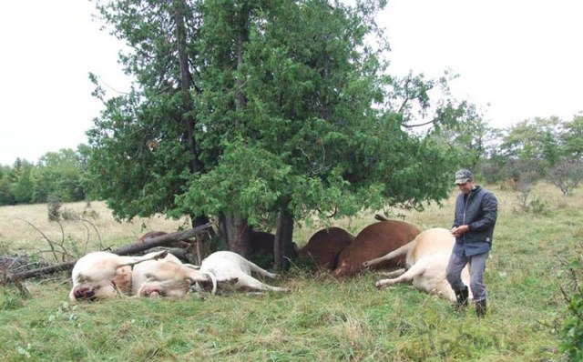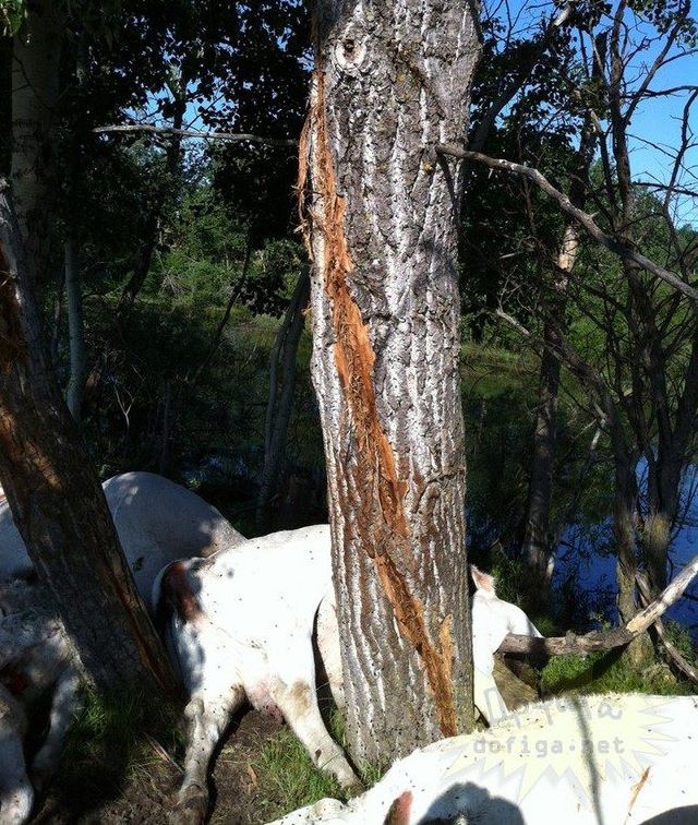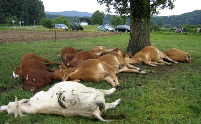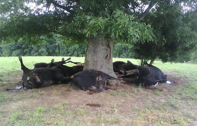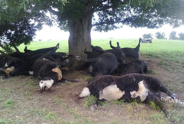 หลบฝนใต้ต้นไม้ วัวโดนฟ้าผ่าตายยกฝูง เซตภาพสุดสลด กับสภาพวัวฝูง นับสอบ ที่ตายจากการถูกฟ้าผ่า ส่วนสาเหตุน่าจะเกิดจากคนต้อน ได้นำวัวไปหลบอยู่ใต้ต้นไม้ขณะฝนตก พอเกินฟ้าผ่า ทำให้กระเเสไฟที่ผ่าต้นไม้ วิ่งตรงเข้าวัว ทำให้เสียชีวิตในทีสุด