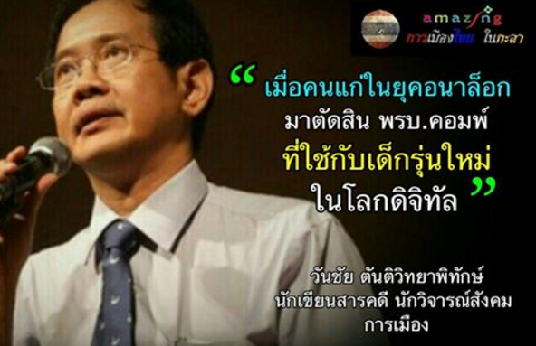 บรรดาสนช.ที่มีอำนาจในการตัดสินใจพรบ.คอมพ์ ส่วนใหญ่น่าจะอายุหกสิบปีขึ้นไป เรียกได้ว่าอยู่ในโลกการสื่อสารยุคเก่า แบบอนาล็อก ที่อาจจะไม่เข้าใจความสลับซับซ้อนของการสื่อสารยุคใหม่แบบดิจิทัล