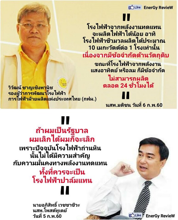 “อีกไม่กี่วันนายกฯจะต้องตัดสินใจเรื่องการสร้างโรงไฟฟ้าถ่านหินที่ จ.กระบี่ ซึ่งผมพูดตรงๆ ว่าหากท่านตกลงจะสร้าง ถ้าผมเป็นรัฐบาลผมเลิกได้ผมก็จะเลิก เพราะปัจจุบันโรงไฟฟ้าถ่านหินนั้นไม่ได้มีความสำคัญกับความมั่นคงทางพลังงานทดแทน ทั้งที่ควรจะเป็นโรงไฟฟ้าปาล์มแทน” นายอภิสิทธิ์ กล่าว
