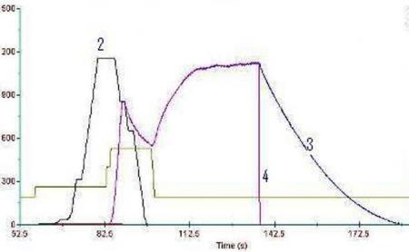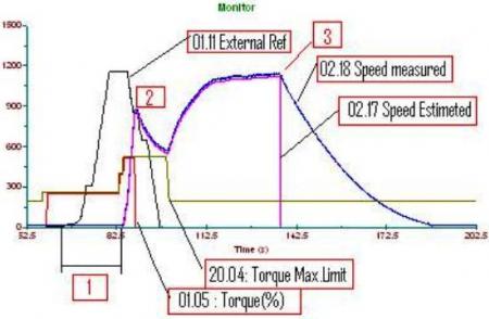 มีเฉพาะ 01.11 ext ref 1 01.05 torque ( จากรูป scale *100 ครับ) ส่วนสปีด ลูกค้าวัด 02.17: SPEED ESTIMATED [rpm] กับ 02.18: SPEED MEASURED [rpm]มาให้ดังรูป ส่วนกระแสไม่ได้วัดมาให้ ไม่ทราบว่าพอวิเคราห์ได้ไหม ถ้าวัดได้มีคำถามอยู่ 3 ประเด็นดังรูป ตรงหมายเลข 1 ; สงสัยว่าทำไม สปีด SPEED ESTIMATED กับ SPEED MEASURED จึงตอบสนองช้า ดูเหมือนจะมีการดีเลย์ ประมาณ 20 วินาที ทั้งที่เป็นระบบโคลสลูป ใช้งานคู่กับเอ็นโค๊ดเดอร์ ตรงหมายเลข 2 ;ทำไม SPEED ESTIMATED กับ SPEED MEASURED จึงมีค่าไม่เท่ากับ 01.11 ext ref 1 หรือวิ่งไปไม่ถึงค่าอ้างอิง และที่สำคัญคือ 01.11 ext ref 1 ลดลงเป็น 0 แล้ว แต่ปรากฏว่า SPEED ESTIMATED กับ SPEED MEASURED ลดลงนิดหน่อย จากนั้นก็กลับวิ่งขึ้นส่วนทางกับ ref. ตรงหมายเลข 3 ; สงสัยว่าทำไม SPEED ESTIMATED ลดลงเป็น 0 แต่ SPEED MEASURED กลับไม่ลดลงทันที่ ซึ่งกว่าจะเป็น 0 ได้ก็ต้องใช้เวลาอีกหลายสิบวินาที |