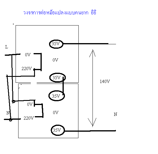 ถ้าด่วนมากแบบนี้คงไปใช้แรง+ความรู้ไฟฟ้าเบื้องต้น ที่มีและขายเลยที่เขาทำขายกันมีเลย ทำเองเลย 220/35 0 35 ,มียัน 10 20 A มีขายยันเปิดท้ายตลาดนัด เอามาสองลูก แบ้งค์ กัน แบบอินเฟส PRI และ อนุกรม ด้านเอ้าท์ ดูรูป ประกอบ แล้วอย่าว่ากัน เด้อ ผมคนรู้ต่ำ อิอิ พอเอาไปใช้แก้ขัดก่อนนะ แล้วไปสั่งพัน ซะ ว่างๆ น่ะ หรือ สงสัยไงก้อโทรมาเด้อ 0839921379 |