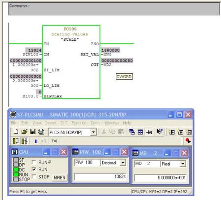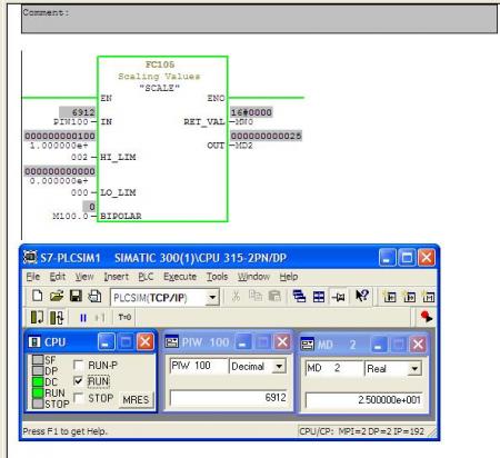 ผมจึงขอยกตัวอย่างเลยก็แล้วกัน ว่าเป็น Analog Input 4 - 20 ma. แต่ตอนนี้ผมไม่มี CPU , Analog , Simulator อยู่ ผมขอใช้ PLCSIM แทนก็แล้วกันนะครับ ( เหมือนๆ กัน ) 1. ผมกำหนดแอดเดรส Analog Input 4 - 20 ma. เป็น PIW100 ครับ 2. ใช้ FC 105 Scale Convert : ทำการสเกลค่า 3. กำหนด Hi = 100.0 และ Low = 0.0 Output = MD2 4. ป้อนค่า PIW100 ( แทนการใช้ตัว Simulator ครับ 4-20 ma ก็จะเท่ากับ 0-27648 ครับ ) รูปที่1 ป้อนค่า 6912 ( 8ma ) ค่า Output ที่ได้คือ 25.0 |