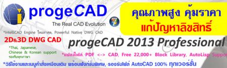 โปรแกรม 2D/3D DWG CAD ทางเลือกใหม่ ประสิทธิภาพสูง ราคาคุ้มค่า สอบถามและทดลองใช้ ก่อนตัดสินใจ - ลดต้นทุนค่าซอฟต์แวร์ได้มากกว่า 6 เท่า เมื่อเทียบกับ AutoCAD - เมนูและคำสั่งการทำงานคล้ายคลึงกันกับ AutoCAD สามารถเปลี่ยนมาใช้ progeCAD ได้ทันที - กินทรัพยากรเครื่องต่ำ, รองรับและเปิดไฟล์ AutoCAD ที่มีขนาดใหญ่และซับซ้อนได้อย่างสมบูรณ์ รวดเร็วที่สุด