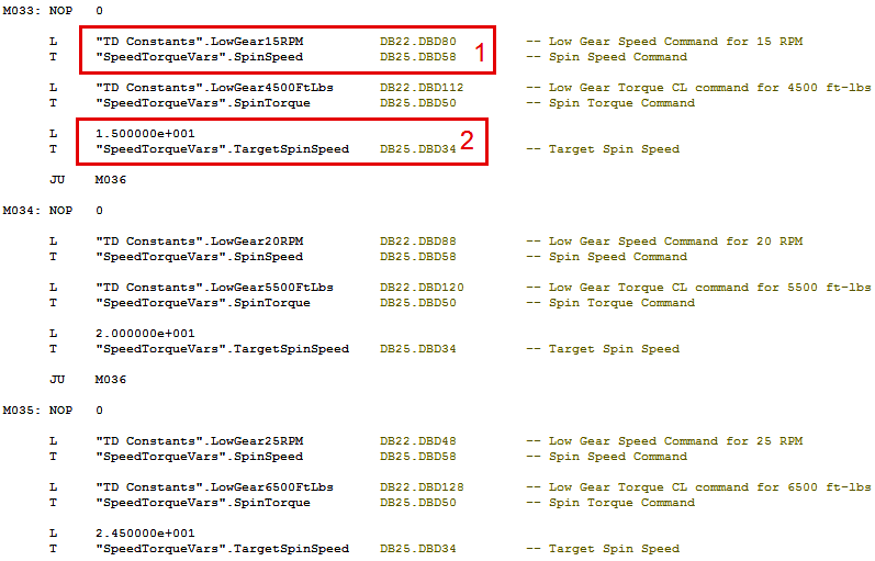 จากโปรแกรมดังรูป มีหลักการคร่าวๆดังนี้ โปรแกรมนี้เป็นโปรแกรมควบคุมความเร็วดีซีมอเตอร์ขนาดใหญ่ ซึ่งเลือกได้สามระดับความเร็วและสามระดับของทอร์ค โดยใช้ดิจิตัลอินพุท(สวิทซ์)เป็นตัวเลือก เมื่อมีการเลือกแล้วโปรแกรมก็จะวิ่งมาโหลดสปีดและทอร์คตามคำสั่งที่อยู่ในบล๊อค เนื่องจากไม่ค่อยเข้าใจภาษา STL ก็เลยสงสัยว่าโปรแกรมจะโหลดค่าจากไหนส่งออกไปเป็นเอาท์พุท ระหว่างค่าที่อยู่ใน DB22.DBD80 (ในกรอบหมายเลข 1) หรือว่าจะโหลดค่า 1.500000e+001 (ในกรอบหมายเลข 2) รบกวนผู้รู้ช่วยแนะนำหน่อยครับ ส่วนที่หนึ่ง |