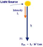 ความเข้มการส่องสว่างในทิศทางใดทิศทางหนึ่งของแหล่งกำเนิดแสงซึ่งมีการกระจายแสงที่สม่ำเสมอในทุกทิศทาง เท่ากับฟลักซ์การส่องสว่างหารด้วย 4¶