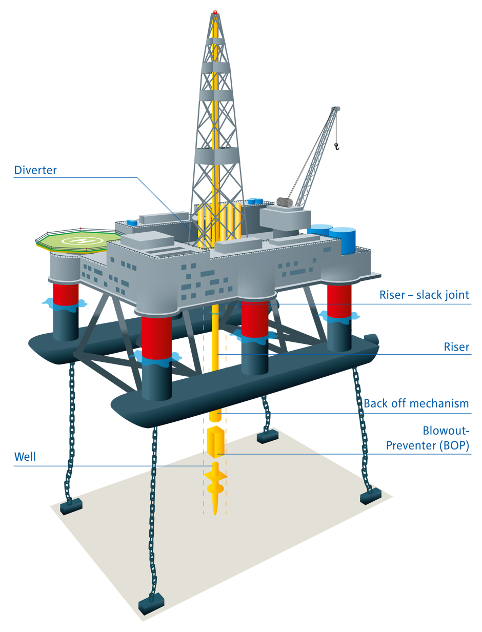 แท่นประเภทนี้เมื่อเข้าสู่ตำแหน่งปฏิบัติการหรือตำแหน่งที่ต้องการเจาะแล้วกัปตันผู้ควบคุมดูแลจะสั่งให้ทำการทิ้งสมอขนาดใหญ่( Huge mooring anchors) ลงสู่ก้นทะเล เพื่อทำหน้าที่ยึดและรักษาตำแหน่งของแท่นเอาไว้เพื่อป้องกันการกระแทกจากคลื่นน้ำทะเล แท่นเจาะแบบเหมาะสำหรับขุดเจาะบริเวณที่มีน้ำลึก ซึ่งบางลำสามารถทำการขุดเจาะได้ลึกถึง 5,000 ฟุต หรือเท่ากับ 1,524 เมตรเลยที่เดียว