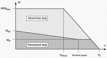จากกราฟแสดงคุณสมบัติจะเห็นว่าพื้นที่การใช้งานของเซอร์โวจะประกอบด้วย 2 ย่าน คือย่านใช้งานปกติแบบต่อเนื่อง(Permanent duty)และย่านใช้งานช่วงสั้นๆ (Short time duty) ส่วนกราฟก็จะประกอบด้วยแกนความเร็ว(X )และแกนทอร์ค(Y )