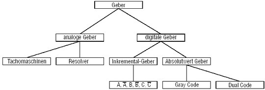 จากรูป เอนโค๊ดเดอร์ (Geber=Encoder) สามารถแยกประเภทตามหลักการได้ 2 กลุ่ม คือชนิดที่ทำงานโดยอาศัยหลักการเหนี่ยวนำหรือเรียกว่าอะนาลอก เอนโค๊ดเดอร์ (Analog Geber=Analog Encoder) และชนิดที่ทำงานโดยอาศัยหลักการดิจิตอล(digital Geber=digital Encoder)