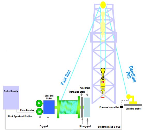 เครื่องจักรนี้ทำหน้าที่ควบคุมหัวเจาะให้เคลื่อนที่ขึ้นลง ซึ่งคล้ายกับเครนยกตู้สินค้า โดยใช้เอซีมอเตอร์ขนาดใหญ่ (2 * 850Kw.) สองตัวเป็นตัวขับเคลือนแบบขนานบนแกนเพลาเดียวกัน (parallel shaft) ผ่านระบบเกียร์ทดรอบ และควบคุมความเร็วด้วยอินเวอร์ ( Multi drives- ABB ACS800 )