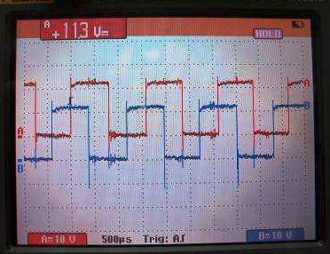 จากภาพจะเห็นว่าสัญญาณจากเอ็นโค๊ดเดอร์นั้นค่อนข้างจะดูดีที่เดียว สัญาณเป็นรูป sqare wave และมี phase shift ระหว่าง A และ B เป็น 90 องศา รวมถึงระดับแรงดันก็อยู่ในระดับมาตรฐาน