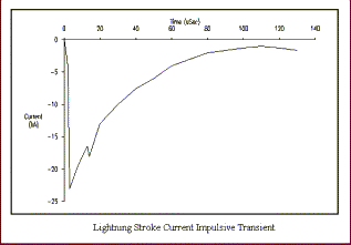 ![]() รูปที่1. กระแสที่เกิดขึ้นจากการเกิดอิมพัลส์ชั่วครู่เกิดโดยฟ้าผ่า |