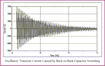 ![]() รูปที่2 กระแสออสซิเลทใชั่วครู่เกิดจากการสวิตชิ่งคาปาซิเตอร์แบบ Back-to-Back |