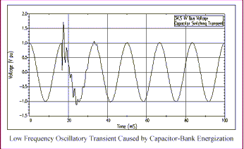 ![]() รูปที่3 แรงดันออสซิเลทความถี่ต่ำชั่วครู่เกิดจากการสวิตชิ่งคาปาซิเตอร์แบบเข้าระบบ |