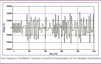 ![]() รูปที่4 แรงดันออสซิเลทความถี่ต่ำชั่วครู่เกิดจากเฟอโรเรโซแนนซ์ในสภาวะหม้อแปลงไม่มีโหลด |