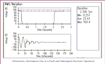 2.3 ไฟดับช่วงสั้น (Voltage Interruption) คือค่าแรงดัน rms มีค่าลดลงต่ำกว่า 0.1 pu. ในช่วงระหว่าง 10 ms - 1 min มีสาเหตุเกิดจากสภาวะความผิดพร่องทางไฟฟ้า ในระบบ ทำให้อุปกรณ์ป้องกันมีการตัดวงจรแหล่งจ่ายไฟออก ดังรูปที่ 8 แสดงการเกิดไฟดับช่วงระยะเวลาสั้นๆ ประมาณ 1.8 sec จากการทำงานของรีโคลสเซอร์ตัดวงจรแหล่งจ่ายออกจากระบบก่อนจะมีการต่อวงจรเข้าไปดังเดิมอีกผลทำให้อุปกรณ์ไฟฟ้า หยุดการงาน |