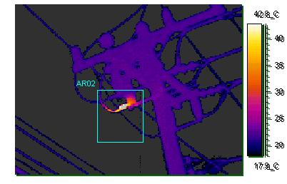 รูปที่ 5 การสูญเสียพลังงานในรูปของความร้อนที่จุดต่อของอุปกรณ์ตัดตอนใน ระบบจำหน่ายไฟฟ้าในประเทศไทย ตรวจสอบโดยกล้องตรวจสอบหาจุดร้อน |