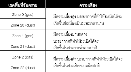 พื้นที่อันตรายเป็นพื้นที่ ที่มีโอกาสจะเกิดบรรยากาศที่ทำให้ระเบิดได้จากการรวมกันของอากาศกับ ก๊าซ, ไอ และฝุ่นที่ติดไฟได้ การจัดแบ่งพื้นที่อันตรายจะสามารถจัดแบ่งได้ดังนี้