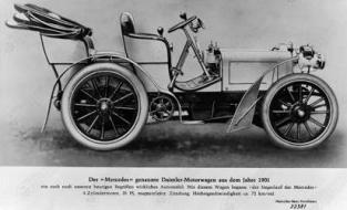 จุดเริ่มต้นของการถือกำเนิด ชื่อแบรนด์เมอร์เซเดส-เบนซ์นั้น เกิดจากชื่อของลูกสาวของเอมิล เยลลิเน็ก ซึ่งมีชื่อว่า “เมอร์เซเดส” หมายถึง “ความสง่างาม” โดยเอมิลนับเป็นลูกค้าคนสำคัญของบริษัท เดมเลอร์-มอร์ทัวร์เรน-เกเซลชาฟท์ (ดีเอ็มจี) ผู้ที่มีบทบาทสำคัญในการเผยแพร่และจัดจำหน่ายรถยนต์ของเดมเลอร์ให้เป็นที่ รู้จัก นอกจากนั้น เยลลิเน็กยังเป็นนักแข่งรถตัวยง โดยใช้นามแฝงว่า “เมอร์เซเดส” ในฐานะนักแข่งเป็นประจำ จนกระทั่งเมื่อวันที่ 22 ธันวาคม ค.ศ. 1900 ดีเอ็มจีได้ส่งรถยนต์คันแรกที่ติดตั้งด้วยเครื่องยนต์ใหม่ล่าสุดด้วย ความเร็ว 35 แรงม้า ซึ่งเป็นรถยนต์ที่มีเครื่องยนต์กำลังแรงสูง ติดตั้งเครื่องยนต์ตรงส่วนหน้ารถและขับเคลื่อนด้วยแรงส่งของล้อด้านหลังสอง ล้อ มีโครงสร้างเป็นเหล็กกล้า ดวงไฟ กระจังหม้อน้ำแบบรวงผึ้ง และมีองค์ประกอบอื่นๆ ที่ทันสมัย นับเป็นประดิษฐกรรมชิ้นโบว์แดงในยุคนั้น โดยเยลลิเน็กได้นำรถยนต์คันดังกล่าวลงสังเวียนแข่งขันความเร็วในสนามที่ เมืองนีซ ในเดือนมีนาคม ปี 1901 จากวันนั้นรถยนต์เมอร์เซเดสได้แสดงความเป็นหนึ่งให้ทุกคนได้ประจักษ์ในทุกๆ ด้าน และกลายเป็นที่สนใจของสาธารณชนมากขึ้น นอกจากนั้นรถยนต์เมอร์เซเดสรุ่น 35 HP ยังเป็นยานพาหนะคันแรกที่ได้รับการยกย่องให้เป็นต้นแบบรถยนต์สมัยใหม่คันแรก ของโลกและส่งผลให้แบรนด์เมอร์เซเดสกลายเป็นตำนานในหน้าประวัติศาสตร์ยานยนต์ ในฐานะแบรนด์รถยนต์สมัยใหม่แบรนด์แรกของโลก นอกจากนั้นยังช่วยสร้างแรงบันดาลใจทำให้เกิดรถยนต์คอนเซ็ปต์ใหม่ๆ อีกมากมายแก่อุตสาหกรรมยานยนต์