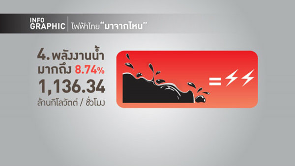 อันดับที่ 4 คือพลังน้ำ ทั้งจากลำน้ำธรรมชาติและน้ำจากอ่างเก็บน้ำต่าง ๆ แนวทางนี้ สามารถผลิตไฟฟ้าได้ร้อยละ 8.74 หรือ 1,136.34 ล้านกิโลวัตต์ชั่วโมง