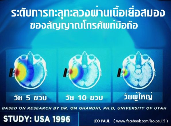 จากงานวิจัยของ Dr.Om Ghandhi แห่งมหาวิทยาลัยยูทาห์ ซึ่งได้ทำไว้เมื่อปี 1996 แสดงให้เห็นว่าเนื้อสมองของวัย 5 ขวบ จะถูกสัญญาณคลื่นโทรศัพท์ทะลุทะลวงได้มากกว่าสมองของวัยรุ่นและผู้ใหญ่