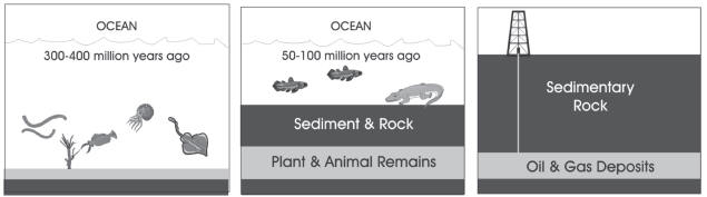 นับเป็นระยะเวลาหลายร้อยล้านปี ที่ซากพืชซากสัตว์ตกลงไปทับถมกันใต้ท้องทะเล และทับถมสะสมขึ้นเรื่อยๆจนเกิดชั้นตะกอน เช่นดิน หิน ทราย และวัสดุอื่นๆ
