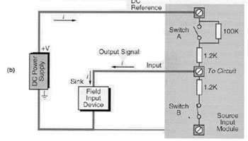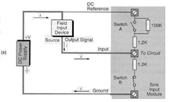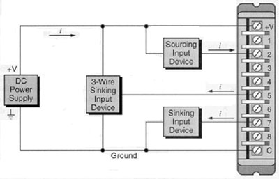 ภาพแสดงลักษณะของการเชื่อมต่ออุปกรณ์เซนเซอร์กับอินพุทโมดูลแบบ Sinking โดยจะทำการเชื่อมต่อแรงดันไฟฟ้าที่มีศักย์เป็นบวก เข้ากับเซนเซอร์ และอีกด้านหนึ่งของเซนเซอร์ จะถูกเชื่อมต่อกับ อินพุท โมดูล ทิศทางการไหลของกระแสจะไหลจาก แรงดันไฟฟ้าที่มีศักย์เป็นบวก ไปยังที่มีศักย์ต่ำกว่า (+ to -) ซึ่งลักษณะแบบนี้จะคล้ายกับโมดูล เป็นตัวรับกระแสจาก เซนเซอร์ เราจึงเรียกโมดูลลักษณะนี้ว่า Sinking Input Module