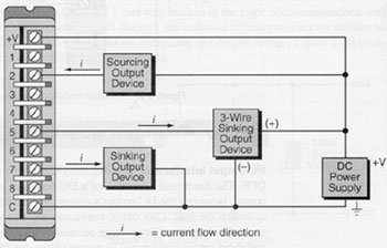 ภาพแสดงลักษณะของการเชื่อมต่อเซนเซอร์ กับอินพุทโมดูลแบบ Sourcing โดยจะทำการเชื่อมต่อแรงดันไฟฟ้าที่มีศักย์เป็นลบ เข้ากับเซนเซอร์ และอีกด้านหนึ่งของเซนเซอร์เข้ากับโมดูลอินพุท ดังนั้น ทิศทางการไหลของกระแสจะไหลจาก แรงดันไฟฟ้าที่มีศักย์เป็นบวก ไปยังที่มีศักย์ต่ำกว่า (+ to -) ซึ่งลักษณะแบบนี้จะคล้ายกับโมดูล เป็นตัวจ่ายกระแสให้กับ เซนเซอร์ เราจึงเรียกโมดูลลักษณะนี้ว่า Sourcing Input Module