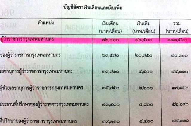 มติชนออนไลน์ รายงานว่า ราชกิจจานุเบกษา ได้ผยแพร่ พระราชกฤษฎีกา กำหนดเงินเดือน เงินเพิ่ม เงินค่าเบี้ยประชุม และเงินตอบแทนอื่นของผู้ว่าราชการกรุงเทพมหานคร ข้าราชการการเมืองอื่นของกรุงเทพมหานคร และกรรมการที่ผู้ว่าราชการกรุงเทพมหานครแต่งตั้ง (ฉบับที่ ๑๐) พ.ศ. ๒๕๕๖ ทั้งนี้ เหตุผลในการประกาศใช้พระราชกฤษฎีกาฉบับนี้ คือ เนื่องจากอัตราเงินเดือนของผู้ว่าราชการ กรุงเทพมหานครและข้าราชการการเมืองอื่นของกรุงเทพมหานคร ตามบัญชีอัตราตำแหน่ง เงินเดือน และเงินเพิ่ม ท้ายพระราชกฤษฎีกากำหนดเงินเดือน เงินเพิ่ม เงินค่าเบี้ยประชุม และเงินตอบแทนอื่นของผู้ว่าราชการกรุงเทพมหานคร ข้าราชการการเมืองอื่นของกรุงเทพมหานคร และกรรมการที่ผู้ว่าราชการกรุงเทพมหานครแต่งตั้ง พ.ศ. ๒๕๒๙ ไม่เหมาะสมกับภาวะทางเศรษฐกิจและค่าครองชีพที่เพิ่มสูงขึ้น ประกอบกับ ข้าราชการประเภทอื่นได้มีการปรับอัตราเงินเดือนเพิ่มขึ้นร้อยละห้า ตามพระราชกฤษฎีกาการปรับอัตราเงินเดือน ของข้าราชการ (ฉบับที่ ๔) พ.ศ. ๒๕๕๔ ตั้งแต่วันที่ ๑ เมษายน พ.ศ. ๒๕๕๔ เป็นต้นมา สมควรปรับปรุง อัตราเงินเดือนของผู้ว่าราชการกรุงเทพมหานครและข้าราชการการเมืองอื่น ของกรุงเทพมหานครให้สอดคล้องกับภาวะทางเศรษฐกิจ ค่าครองชีพ และอัตราเงินเดือนของข้าราชการดังกล่าว จึงจำเป็นต้องตราพระราชกฤษฎีกานี้ ทั้งนี้ตามบัญชีอัตราเงินเดือนและเงิน เพิ่มใหม่ ผู้ว่า กทม. รับเงินเดือน 72,060 บาท เงินเพิ่ม 41,500 บาท/เดือน รวมเดือนละ 113,560 บาท รองผู้ว่าฯ กทม. เงินเดือน 69,570 บาท/เดือน เงินเพิ่ม 20,750บาท/เดือน รวม 90,320 บาท/เดือน ดูรายละเอียดตามตารางประกอบ ด้านล่างนี้