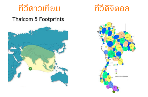 สามารถให้บริการในพื้นที่กว้างและพื้นที่ห่างไกลเช่น ดาวเทียมไทยคม 5 c-band ครอบคลุมพื้นที่หลายประเทศในภูมิภาค แต่ทั้งนี้ขอบเขตพื้นที่การให้บริการของดาวเทียมอาจมีปัญหาในด้านลิขสิทธิ์ การออกอากาศ เช่น ลิขสิทธิ์การถ่ายทอดฟุตบอล ซึ่งทีวีดิจิตอลสามารถควบคุมพื้นที่การให้บริการได้ดีกว่า มีช่องรายการที่แพร่ภาพได้ทั่วประเทศ หรือช่องรายการที่แพร่ภาพเฉพาะภูมิภาคหรือบางพื้นที่ได้ เช่นทีวีภูมิภาค ทีวีชุมชน เป็นต้น หรือเพื่อรองรับในด้านความมั่นคง หรือการแจ้งเตือนเหตุฉุกเฉินหรืออุบัติภัย ที่สามารถเลือกแจ้งเตือนเฉพาะพื้นที่ได้