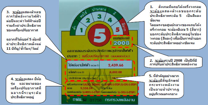 1) สังเกตที่แถบโค้งครึ่งวงกลม จะต้องแสดง ตัวเลขบอกระดับประสิทธิภาพระดับ 5 เป็นสีแดงชัดเจน โดยตรงจุดศูนย์กลางของแถบโค้งครึ่งวงกลม จะต้องมีเลข 5 (สีขาว) บอกระดับประสิทธิภาพอยู่ในช่องวงกลม (สีแดง) เพื่อเป็นการยํ้าบอกระดับประสิทธิภาพอย่างชัดเจน