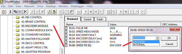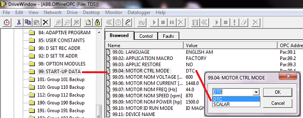 ตัวอย่าง การเลือกโหมดใช้งานของ ABB อินเวอร์เตอร์หรือไดร์ฟ ซึ่งจะมีโหมดการใช้งานให้เลือกอยู่สองโหมดด้วยกัน คือ Direct Torque Control (DTC) และโหมด scalar และสำหรับโหมด DTC ก็จะมีสองทางเลือกโดยขึ้นอยู่กับพารามิเตอร์กรู๊ป 50 ว่าจะกำหนดอย่างไร ดังรูปด้านล่าง