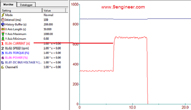 หากพิจารณาจากรูปกราฟด้านล่าง จะเห็นว่าระบบควบคุมของไดร์ฟจะสั่งการให้ภาคเพาเวอร์ (power unit ) ทำการฉีดกระแส ( Inject) เข้าไปยังขดลวดของมอเตอร์ เพื่อทำการอ่านค่าอิมพีแดนซ์ ( Z = R+Jxl ) ของเมอเตอร์เพื่อปรับจูนค่า PI controller ดังรูป