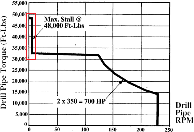 ตัวอย่างกราฟแสดงสมรรถนะของเครื่องจักรชนิดหนึ่ง ซึ่งใช้เกียร์ทด 11:1 โดยประมาณ และความเร็วรอบที่เพลา(shaft) สามารถปรับได้ตั้งแต่ 0 -125 RPM เครื่องจักรนี้ใช้มอเตอร์ขนาด 350 แรงม้า 2 ตัว ช่วยกันขับเคลื่อน