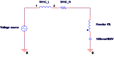 รูป ที่ 1 ตังอย่างวงจรสมมูลย์ของการติดตั้ง Tuned filter 1 ที่ออเดอร์ 5 เข้ากับหม้อแปลง พิกัด 2,500kVA 22/0.4kV โดยใช้คาปาซิเตอร์ 100kvar ร่วมกับ Reactor 4%