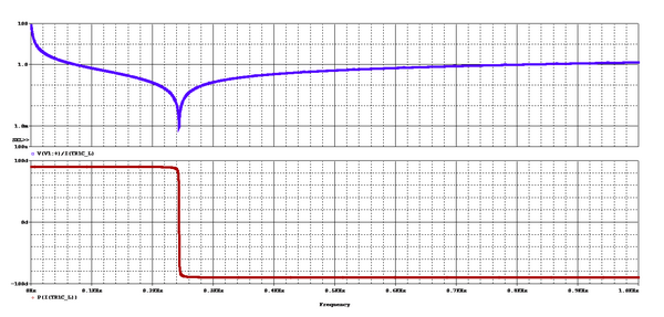รูปที่ 2 (รูปบน) กราฟสีน้ำเงินอิมพีแดนซ์ของระบบปรากฏที่แหล่งจ่าย (รูปล่าง) กราฟสีแดงแสดงมุมของอิมพีแดนซ์ของระบบปรากฏที่แหล่งจ่าย
