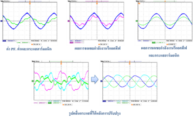 รูปคลื่นกระแสไฟฟ้าตัวอย่างแสดงการทำงานเปรียบเทียบการทำงานกรณีชดเชยเฉพาะ กำลังงานรีแอคทีฟและชดเชยกำลังงานรีแอคทีฟและกระแสฮาร์มอนิกพร้อมกัน