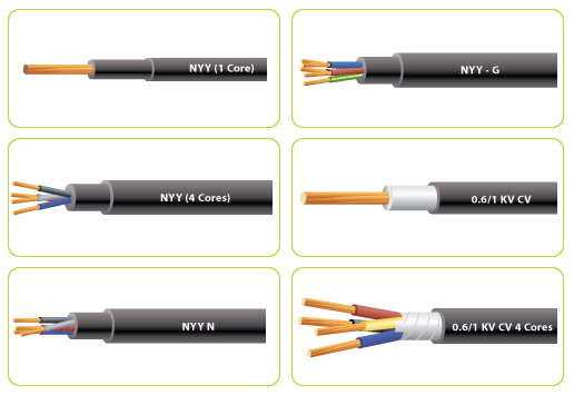 - สายไฟฟ้าที่มีชนิดของฉนวนเป็น PVC ทนอุณหภูมิได้ 70 c และ ตัวนำเป็นทองแดงเช่น สายไฟฟ้าชนิด NYY , NYY-N , NYY-GRD