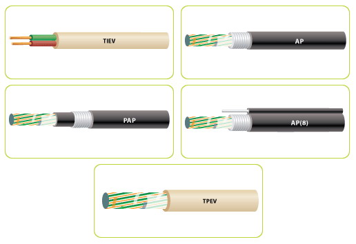 - สายโทรศัพท์ ภายนอกอาคาร เช่น สายชนิด AP, AP-FIG-8 , AP-FSF