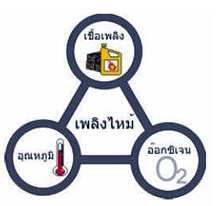 1. เชื้อเพลิง (FUEL) คือสิ่งที่ติดไฟและลุกไหม้ได้ 2. ความร้อน (HEAT) คือ ความร้อนที่เหมาะสมและเพียงพอ สามารถทำอุณหภูมิสูงจนทำให้สารเชื้อเพลิงจุดติดไฟ เช่น สะเก็ดไฟ ลูกไฟจากการเชื่อม เครื่องจักรร้อน ไฟฟ้าช็อต เปลวไฟ บุหรี่ ฟ้าผ่า ฯลฯ 3. อากาศ (OXYGEN) ในบรรยากาศทั่วไปมีออกซิเจน ประมาณ 21 % อยู่แล้ว ซึ่งสามารถทำให้ช่วยติดไฟได้ |