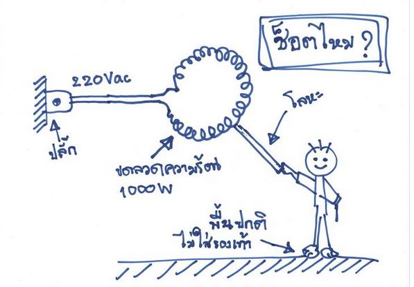 กรณีในภาพ ถ้าถือโลหะไปแตะโดนขดลวดความร้อน ผลคือ ช็อตหรือ ไม่ช็อต ? เพราะอะไรครับ ?