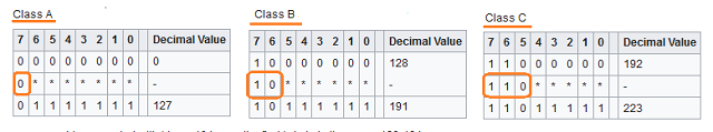 - class A ตัวเลขบิทแรกมีค่าเป็น 0 ดังนั้นแอดแดรสที่เป็นไปได้คือตั้งแต่ 0 - 127 (00000000 - 01111111)